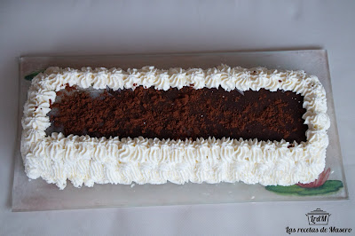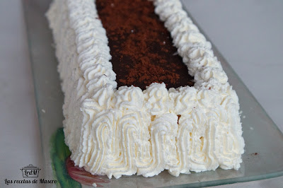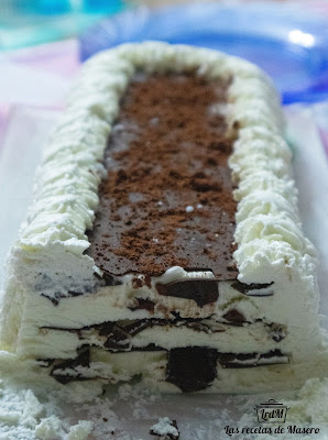 Empezamos a montar la nata (crema de leche), empezamos con la nata (crema de leche), lámina de chocolate, nata (crema de leche) y así alternando hasta hasta acabar con todas las láminas y a acabar con la nata (crema de leche). Tapamos con film y metemos en el congelador hasta que solidifique.
