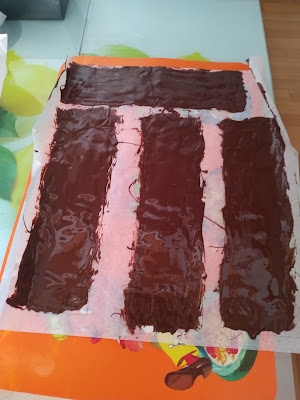 Con ayuda de una brocha de silicona y sobre papel vegetal vamos haciendo las láminas de chocolate , como se aprecia en las fotografías, han de ser finitas, dejamos enfriar en la nevera.