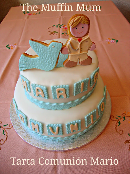 Arriba de la tarta iban cuatro galletas, dos galletas de niño de comunión (imitando a Mario y su traje) y dos galletas de paloma de la paz. En la foto solo veis dos porque las puse solo para la foto y las quité para el transporte.