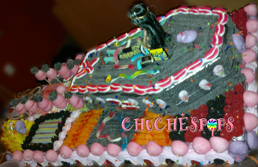 Hoy os pongo la tarta de chuches más grande, que he hecho, medía más de 1 metro de larga era para una comunión, la de Blanca y como no quería llenarla toda con lenguas de regaliz porque a los niños normalmente no les gusta, la base la hice con moras y puse una piramide en una esquina, con un jardin de rosas en el centro y más jardines en lo laterales y como toque final serpientes como no,ya que la muñeca es Cleo del Nilo.