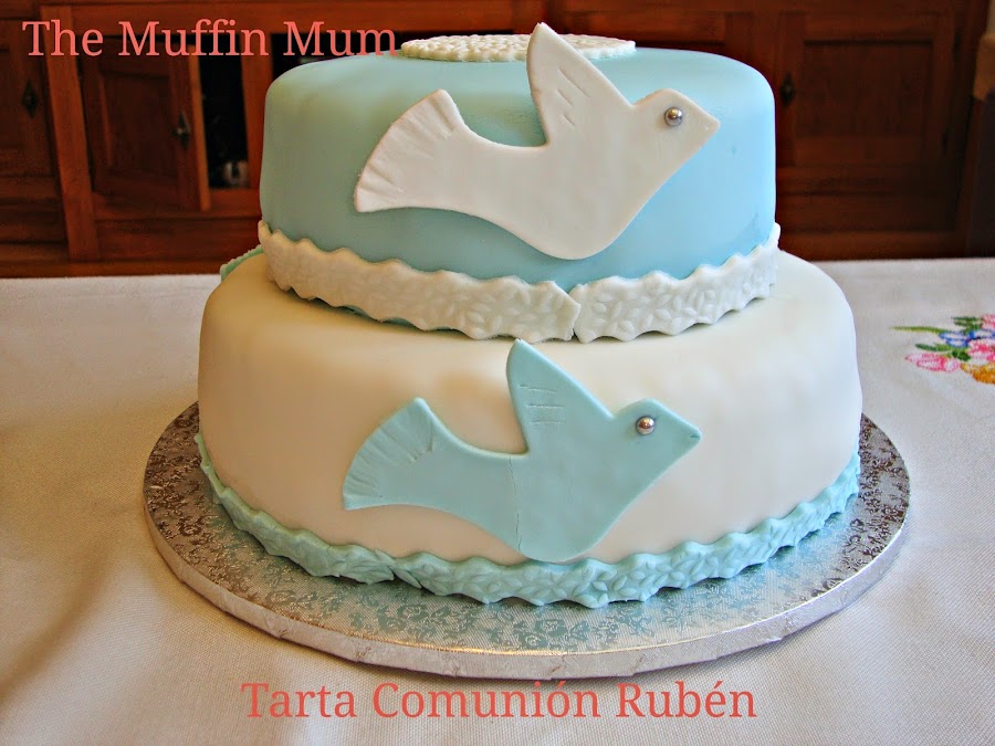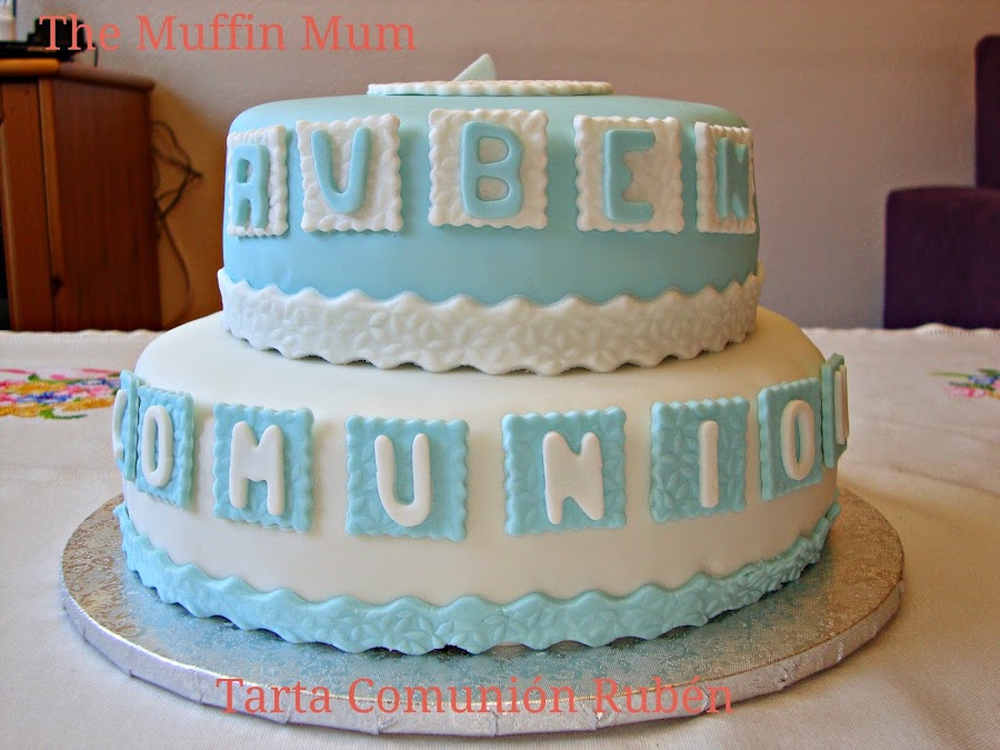 En ambos pisos el bizcocho es un Velvet, relleno de frosting de queso y con cobertura de ganache de chocolate. Los detalles están realizados con fondant blanco y azul.