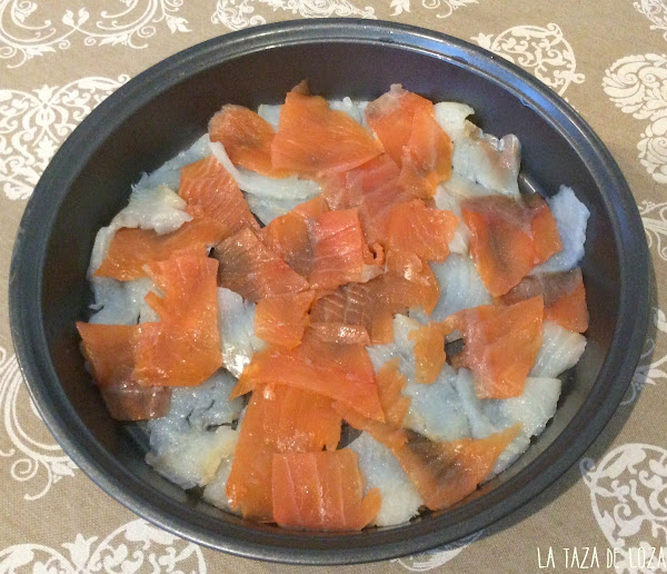 Se empieza por los ahumados cortados en trozos pequeños como de 3 x 3 cm y luego va una capa de arroz.