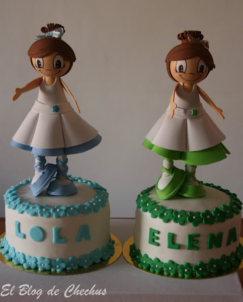 La foto que veis son las tartas que hice para ellas. Ya tuve algo de problemas, por el calor, para trabajar el fondant, pero al final resistieron.