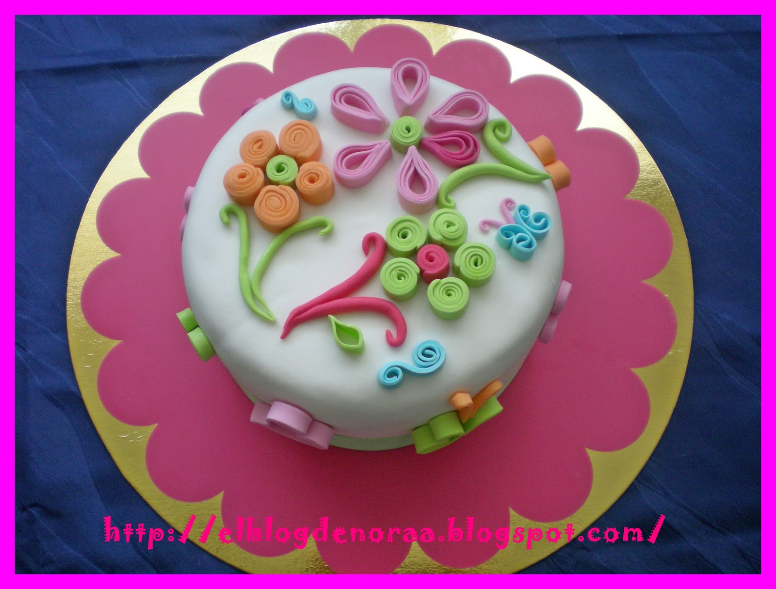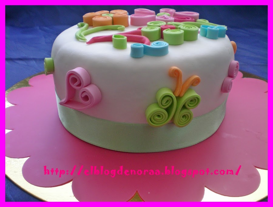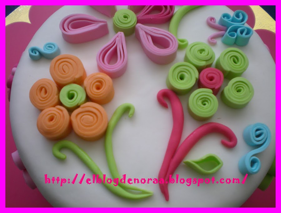 Esta tarta no salió como yo esperaba, fué un poco desastre, pero aún así la subo, más que nada por enseñar la técnica Quilling, que queda muy bien. Iba a ser una tarta de dos pisos, ya tenia echo los dos bizcochos, rellenos y cubiertos, pero ¿que pasó? no tenía demasiado fondant y solo me dio para cubrir uno y no tenia tiempo de hacer mas, por que íbamos de cumple y luego salíamos para el pueblo, en fin, que un poco desastre.