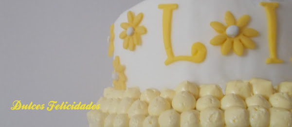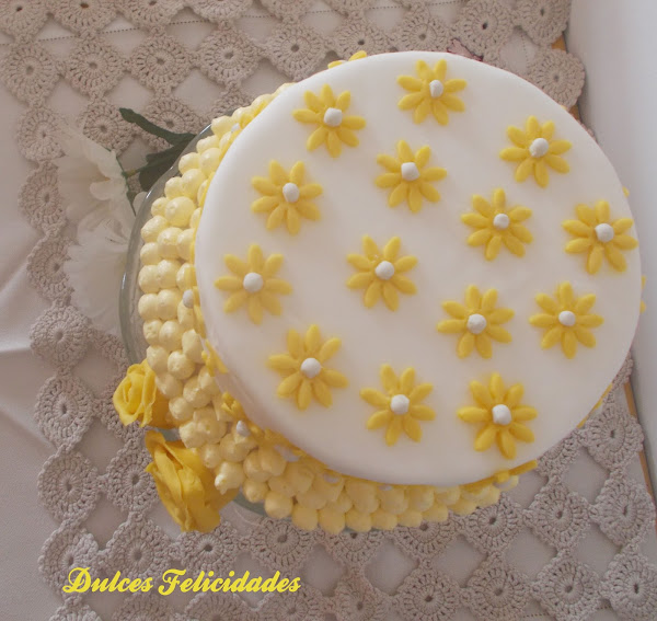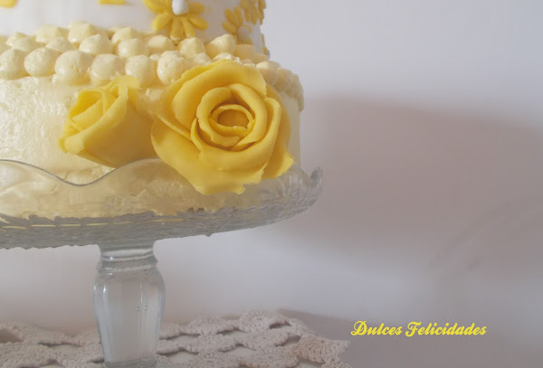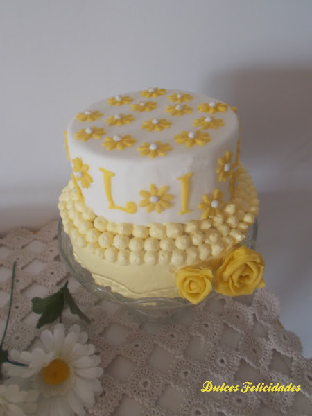 Así que, finalmente, lo que veis es lo que salió: una tarta de dos pisos con margaritas y rosas en tonos amarillos. El piso de arriba era falso, cubierto con fondant, y decorado con las margaritas y las iniciales de las niñas. El inferior era un bizcocho de nata (crema de leche) relleno de buttercream de chocolate con leche y decorado con buttercream teñida de amarillo.