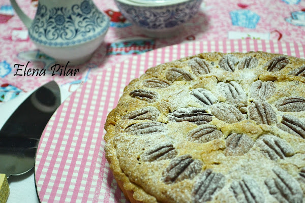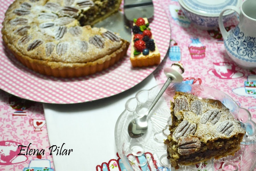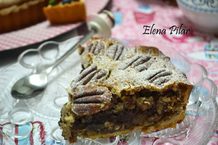 Es una tarta riquísima. Con una base crujiente, con un sabor parecido al de las galletas de mantequilla, y un jugoso relleno con trocitos de chocolate y crujientes nueces pecanas.