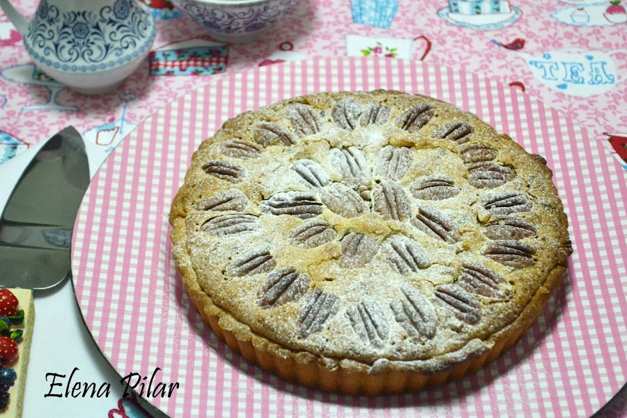 Vertemos esta preparación sobre la masa cocida, colocamos el resto de las nueces sobre la superficie de la tarta, y horneamos 40 minutos a 180ºC. Dejamos enfriar antes de desmoldar.
