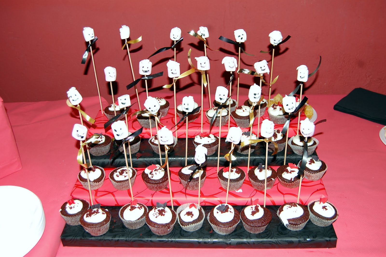 También prepare unos Cup Cakes Red Velvet , sobre un stand cake casero, hecho con una placa de corcho forrada con papel de regalo con forma de escalera , lo remataban unas nubes a la que le pintamos una caritas con colorante alimentario y con glasa blanca le hicimos el pelo ( esto lo vi en uno de vuestros blogs ,pero perdonad que no lo cite por que no lo recuerdo,si alguien lo sabe que me lo diga y lo enlazo)