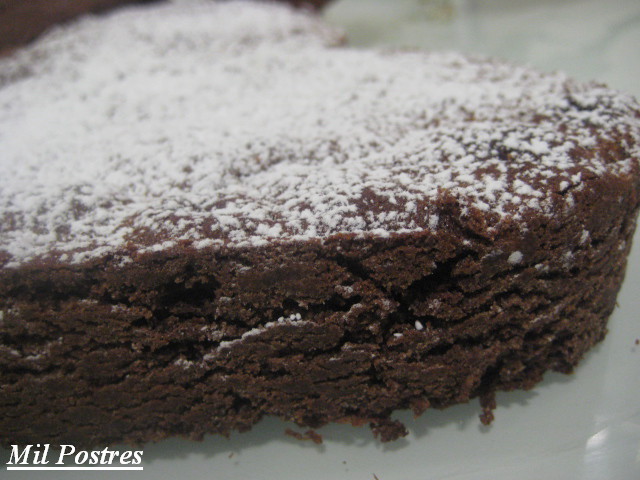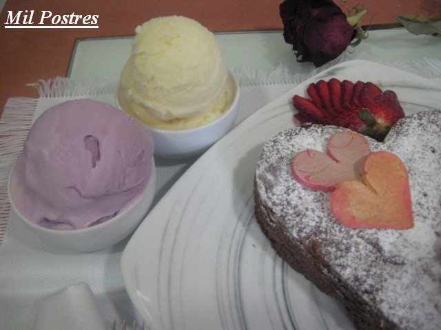 Preparación : Batir las yemas con la mitad del azúcar hasta que estén espumosas. Batir las claras y cuando estén a medio montar añadir el resto del azúcar y dejar que lleguen a estar a punto de nieve. Fundir el chocolate con la mantequilla a fuego suave y dejar entibiar. Mezclar la crema de chocolate con el batido de yemas de huevo y luego con mucho cuidado para que no pierdan volumen añadir las claras a punto de nieve. Engrasar y enharina un molde yo lo he hecho cuadrado y verter la crema obtenida. Cocer en el horno a 180-185º C hasta que esté hecho, pinchar con una aguja esté casi limpia, si queda una pizca manchada no pasa nada, queda más blandito. Dejar enfriar y desmoldar. Cortar en forma de corazón una porción y reservar. Colocar el corazón en un plato, salpicar con azúcar glas, adornar al gusto, yo he puesto unas fresas y unos corazones de mazapán y acompañar si se quiere con helado. Un postre muy seductor para cualquier época del año y mucho más para el día de San Valentín que lo hará si cabe mucho más especial.