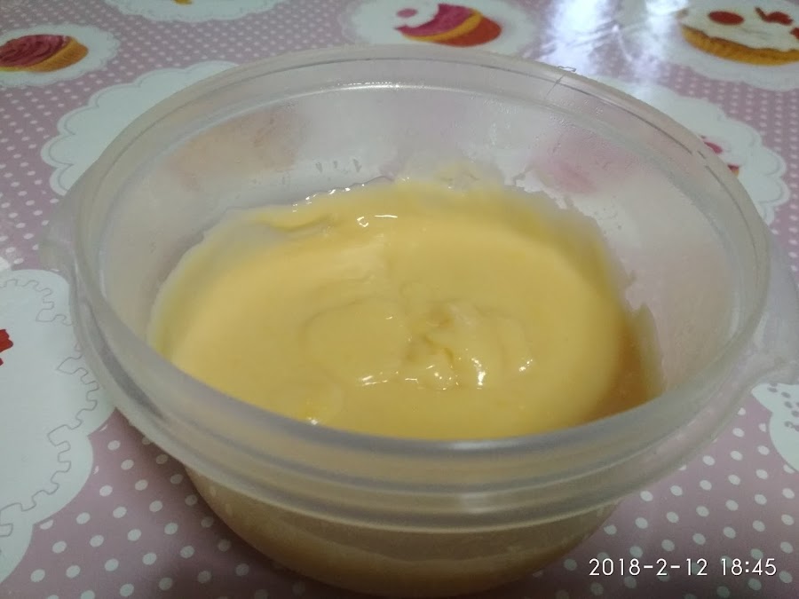 En un recipiente apto para el microondas se mezclan las yemas con el azúcar, se añade la Maicena disuelta en la leche fría, se añade la nata (crema de leche) y se incorporan las pieles de limón. Se mete al microondas 2 minutos, se saca se remueve y se repite minuto a minuto hasta que haya espesado y tenga la consistencia de crema pastelera.
