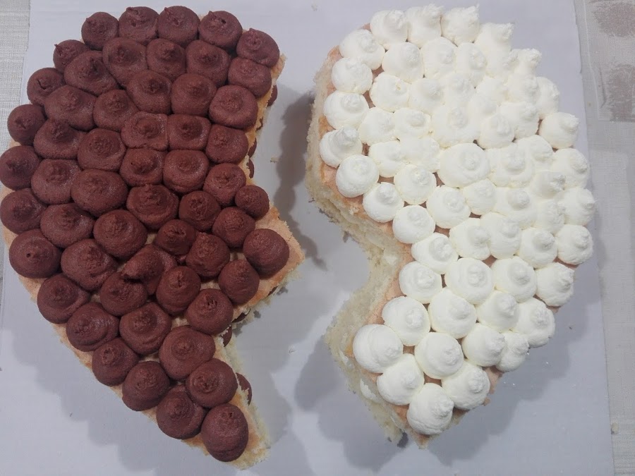 Cortamos el bizcocho en un zing-zang por el centro del corazón y cortamos en dos