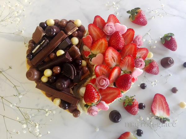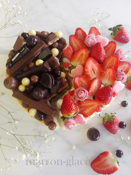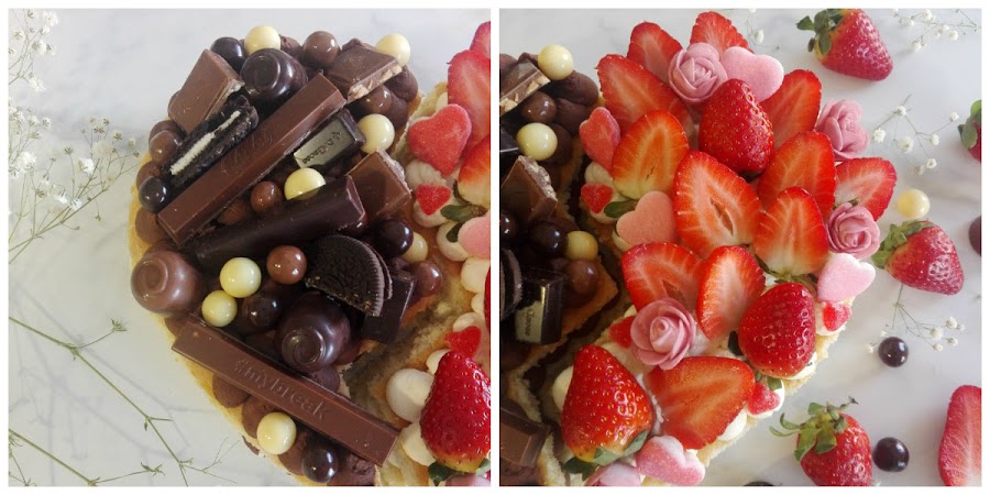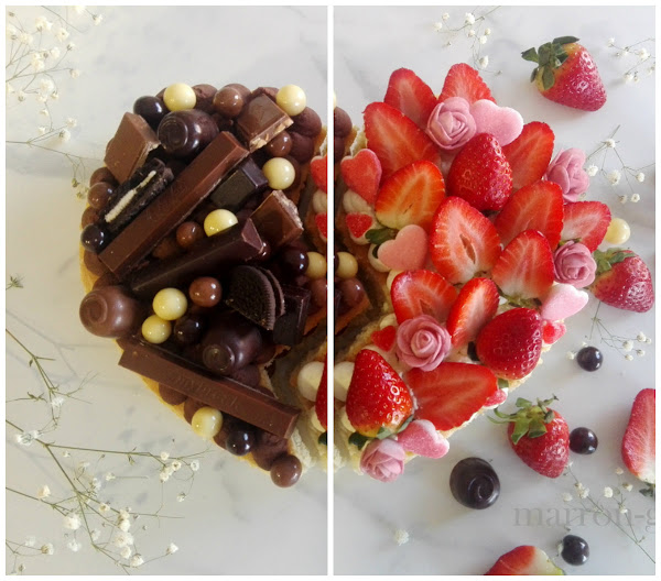 Ahora solo nos queda que adornar la parte de chocolate con bombones,galletas,etc..y la parte de nata (crema de leche) con fresas.También podéis echar coulis de fresas o chocolate derretido por encima de la decoración.