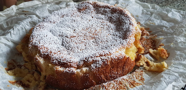 14. Desmoldamos la tarta y espolvoreamos con azúcar glas. Sírvela cortada en porciones y si te da tiempo con salsa de frutas rojas.