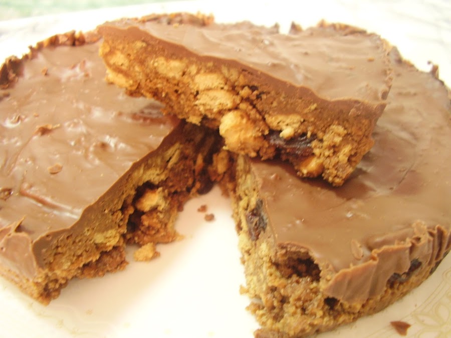 Fundir la mantequilla en el microondas hasta que esté líquida, poner en un bol y agregar el cacao en polvo, las pasas y agregar las galletas y mover hasta integrarla bien.