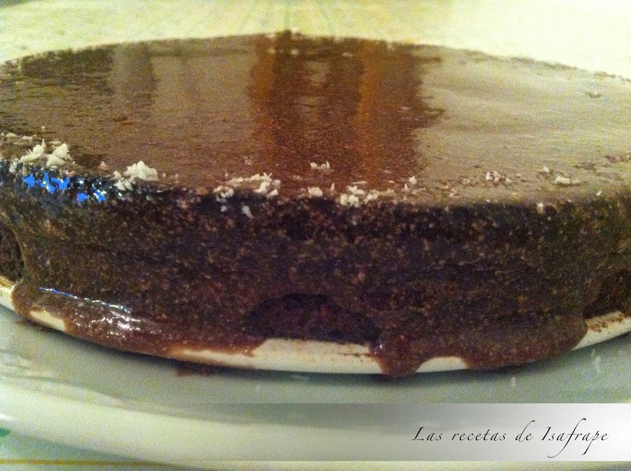 Desmoldamos en caliente, dejamos enfriar un poco y cubrimos con el chocolate reservado. Yo lo adorné con coco rallado o lo podéis dejar tal cual.