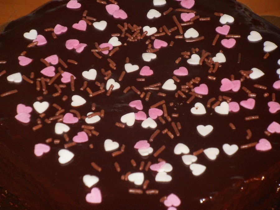 Para terminarla mi hijo la quiso adornar con corazones de azucar que teniamos por casa y asi quedo la tarta