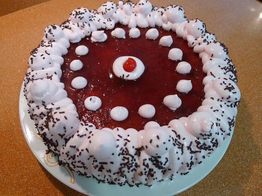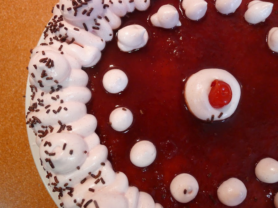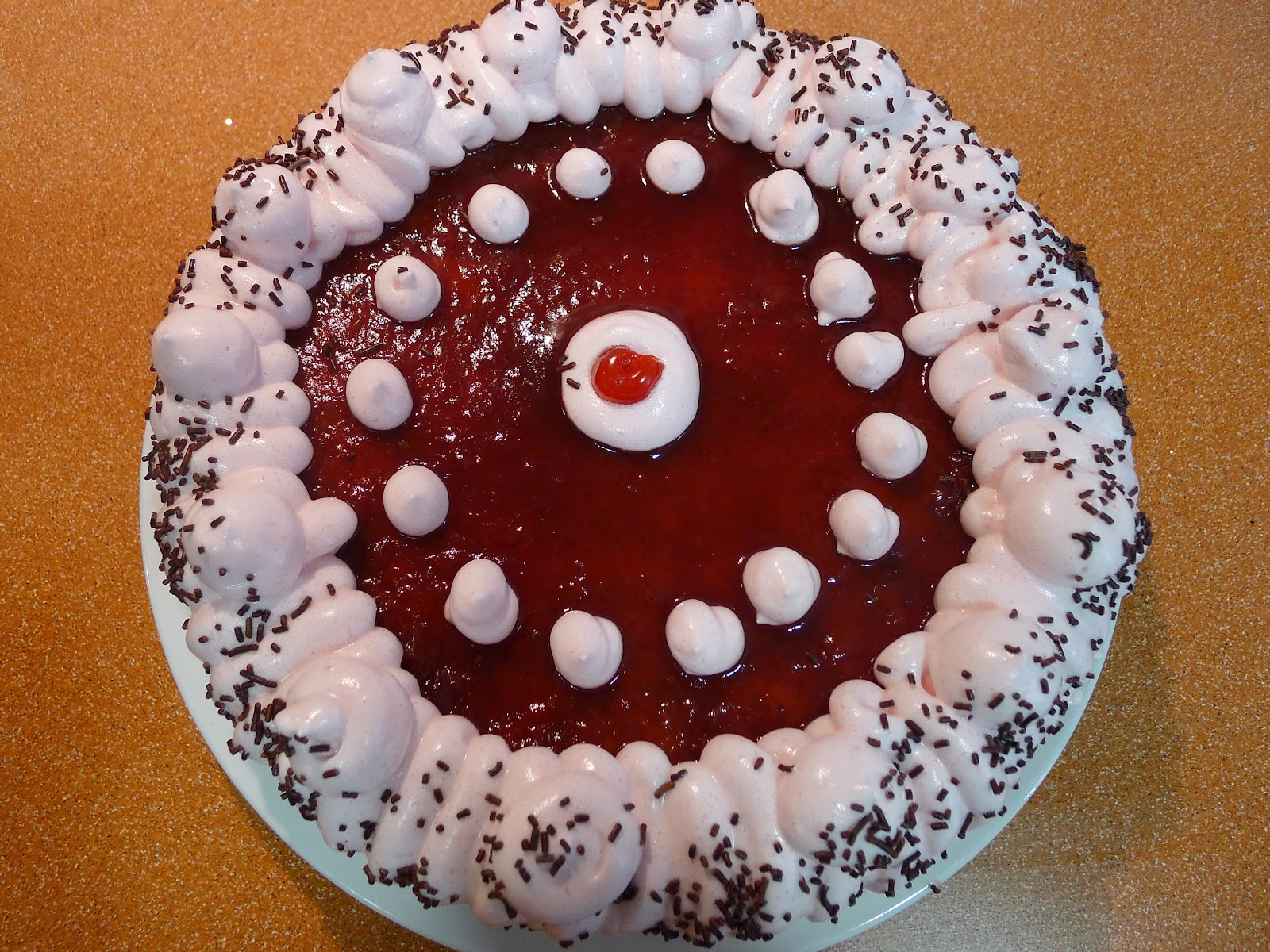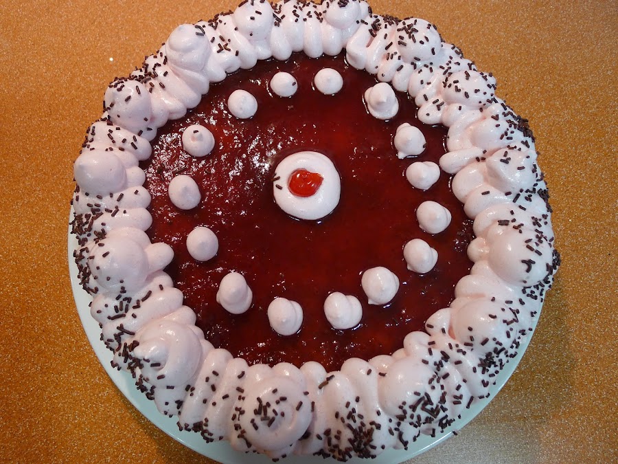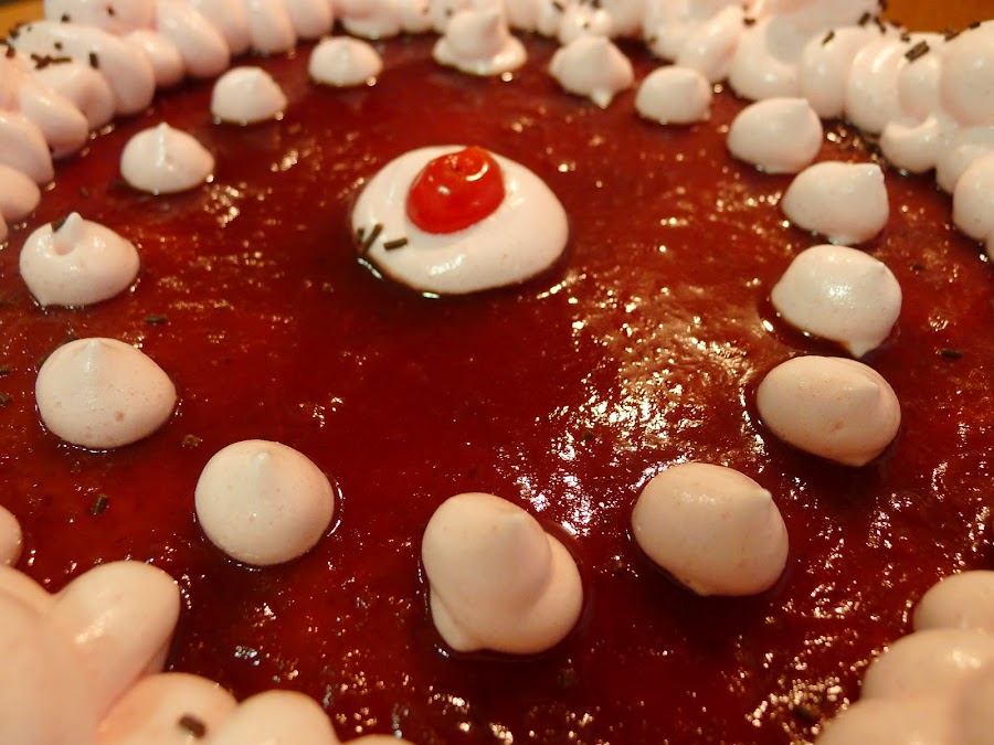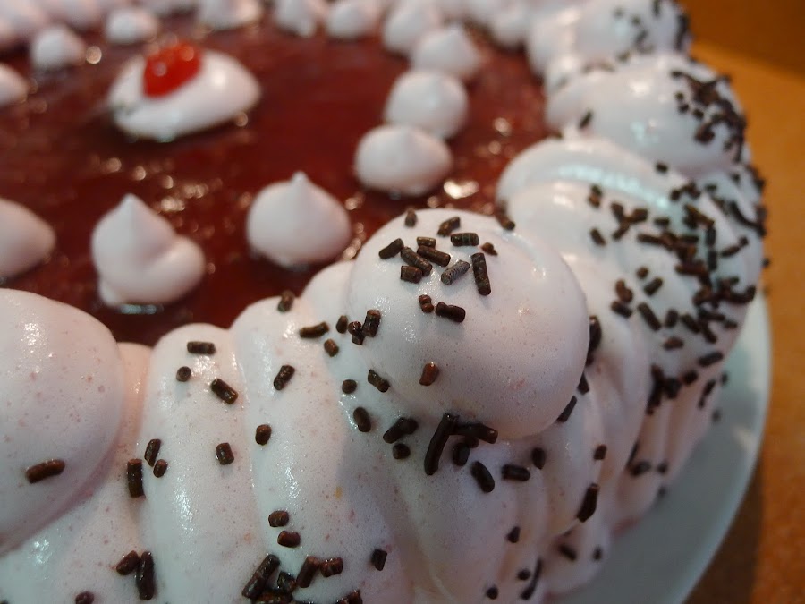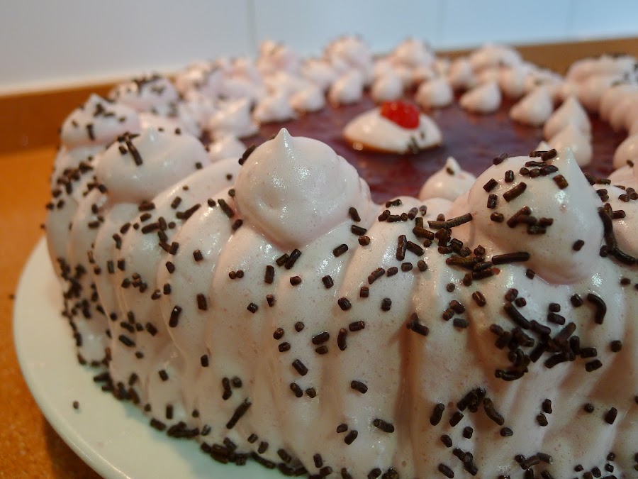 Ahora hacemos el almibar para bañar los bizcochos,llevando al micro 2 o 3 cucharadas de la mermelada de fresa junto a otras de agua(lo hago a ojo) .Bañamos bien los bizcochos con ayuda de un pincel de cocina y procedemos a rellenar con la crema,asi con los dos primeros discos de bizcocho,al tercero,lo cubriremos de mermelada de fresa,para ello llevamos al micro el medio tarro de mermelada con unas cucharadas de agua para que quede mas disuelta y añadimos las hojas de gelatina previamente hidratadas.Una vez hecho todo esto,solo nos quedara el merengue de fresa,que haremos como os explico aqui.
