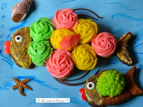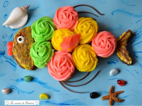 Montaje : Sobre una bandeja de cartón ponemos una cartulina de color de azul. Disponemos los ocho cupcakes de vainilla (le puse menos cantidad que la original pues sino el pez era enorme). Decoramos con la cobertura utilizando los colores que mas nos gusten , toca ponerse con la manga pastelera , ayyyyy , allá vamos pues ja ja?..Cubrimos cada cupcake (utilicé la boquilla 1M de Wilton) . Para el pez pequeño, una de de boquilla lisa