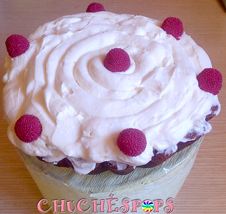 Con la manga Pastelera hice una rosa y le añadí moras rojas de chuche para ponerle mi toque jejeje!Y además, decoré la rejilla con papel pinocho amarillo a modo de expositor.