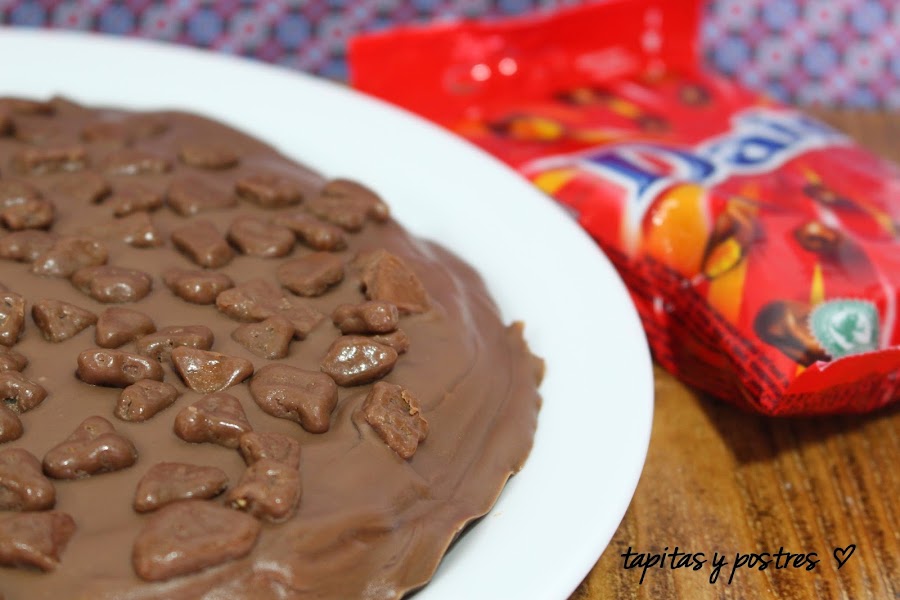 Y antes de que se seque el chocolate le ponemos por encima los caramelos Daim. Dejamos en la nevera otra hora. Cuando veáis que el chocolate está duro, retiramos el papel vegetal del plato.