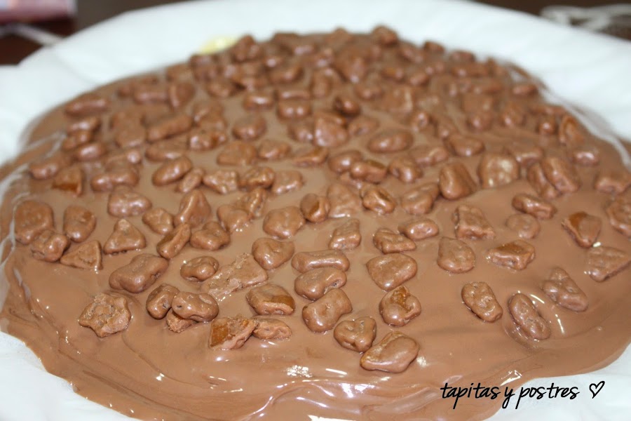 Por último y antes de que se seque el chocolate se esparcen las bolitas de Daim por encima.