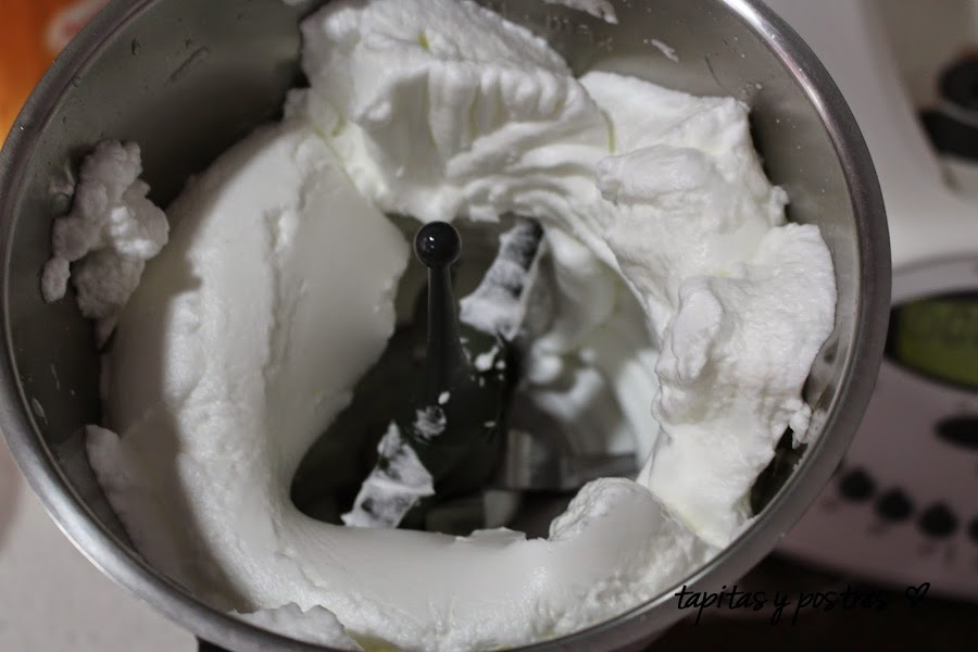 Separar las claras y las yemas. Reservar las yemas y montar las claras 4 minutos a velocidad 3 ½ .