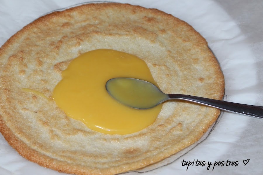 Poner la primera base de merengue. Extender una parte de la crema. Tapar con la otra base de merengue y volver a cubrir de crema.
