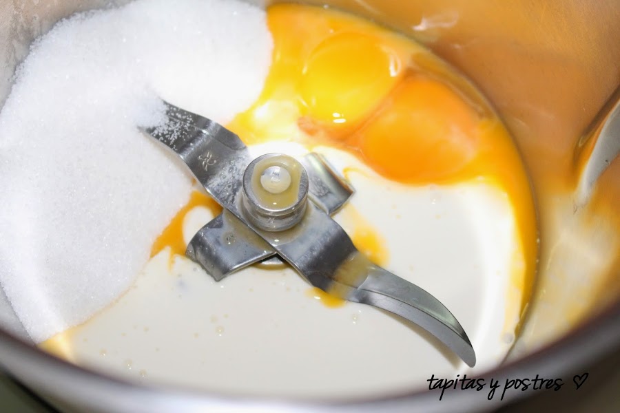 Ahora hacemos la crema, ponemos la nata (crema de leche), las yemas y el resto del azúcar con la maicena y programamos 7 minutos, 90º velocidad 4.