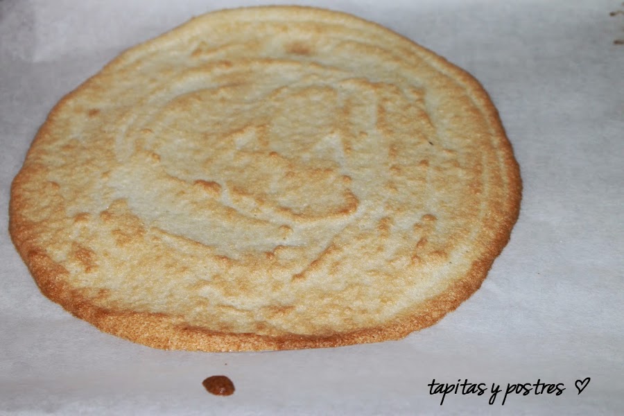 Ya tenemos los pasos listos, vamos a montar la tarta. Con el mismo papel en el que hemos horneado los discos, cortamos el centro y lo ponemos sobre el plato donde la vayamos a servir.