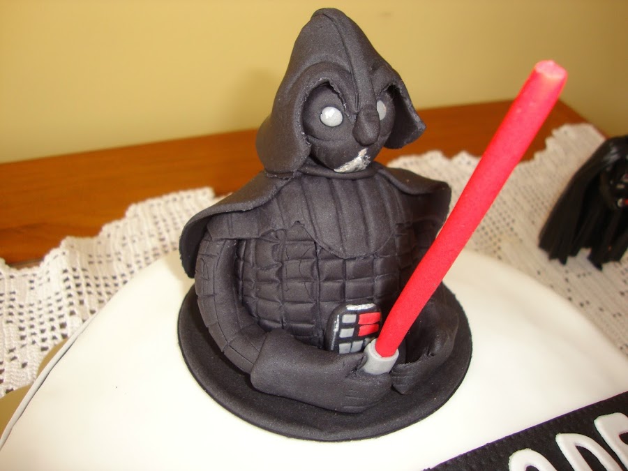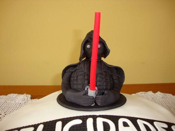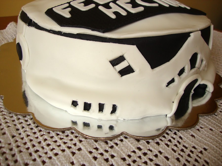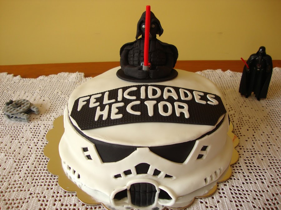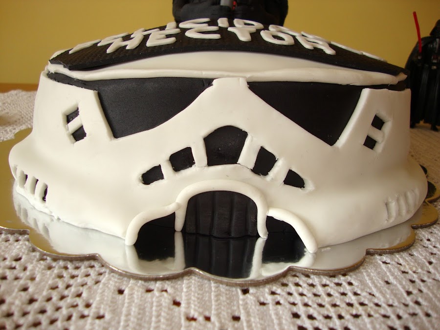 Toda la decoración está realizada con fondant imitando un casco de una tropa de asalto y arriba a Darth Vader.