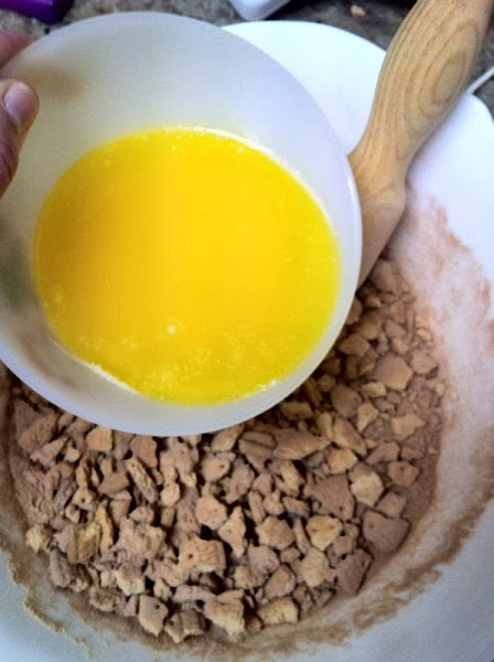 A continuación, derretiremos la mantequilla en el microondas, y la mezclaremos con las galletas.