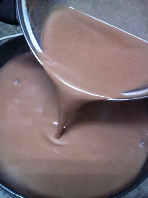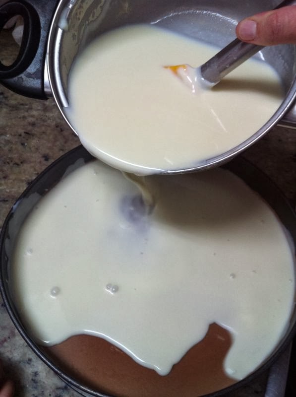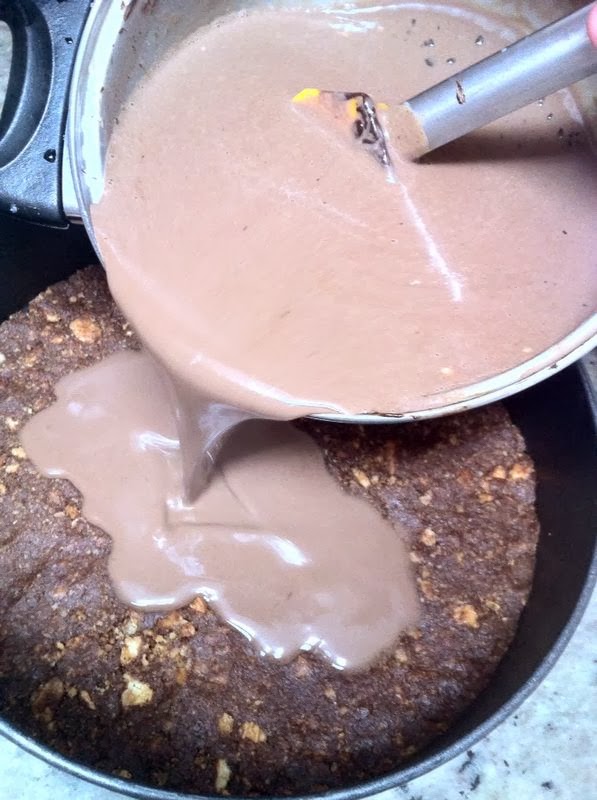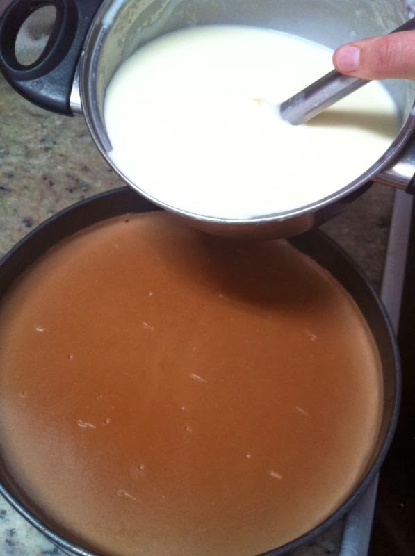 Cuando hierva, retiraremos del fuego y añadiremos al molde. Para que se nos agarre bien a la capa de chocolate negro, haremos unas rayas con el cuchillo y verteremos la mezcla.
