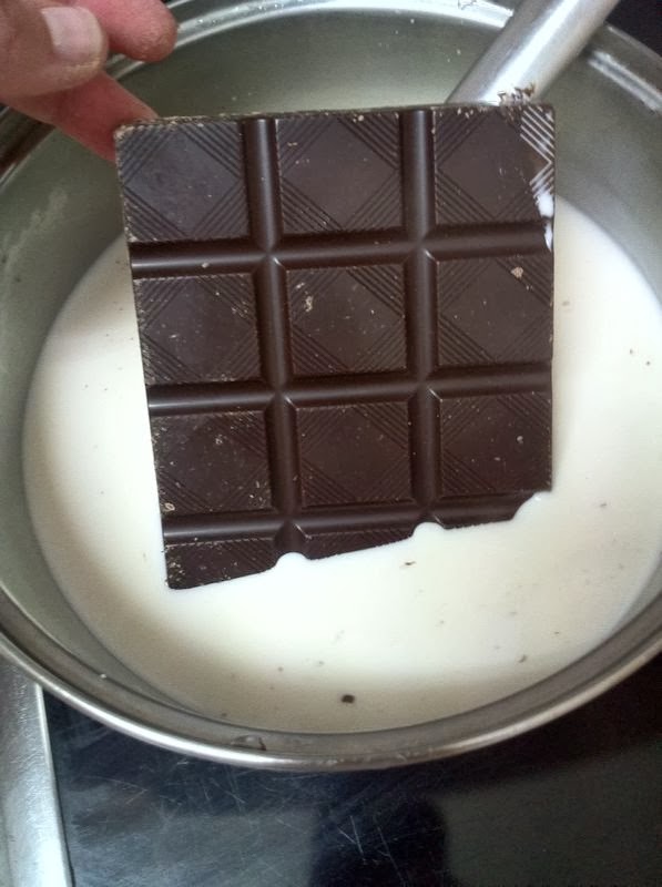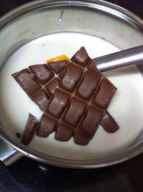 250 ml de nata (crema de leche) y 200 de leche, junto con los 150 gr de chocolate con leche. A fuego medio, vamos removiendo con cuidado de que no se pegue al fondo.