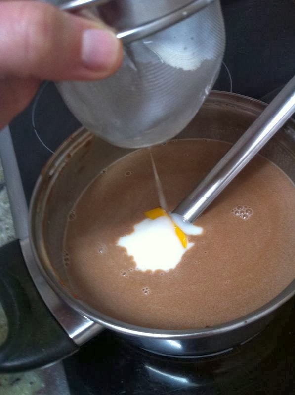Cuando el chocolate este derretido, añadiremos el vaso con el sobre de cuajada. Si veis que queda algún grumo, lo colaremos.