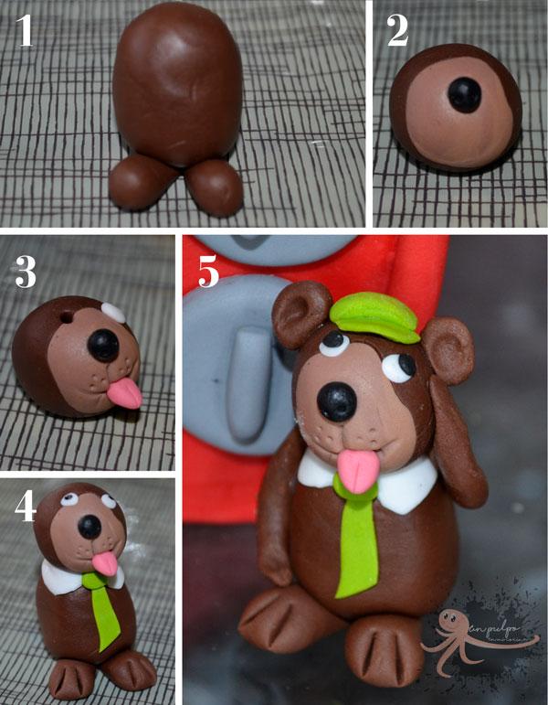 Añadimos todas las piezas al cuerpo ayudándonos de palillos que no retiraremos hasta que el fondant haya secado por completo. Preparamos los zapatos con 2 bolitas de fondant y ponemos algo bajo las piernas para que no se deslicen.