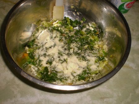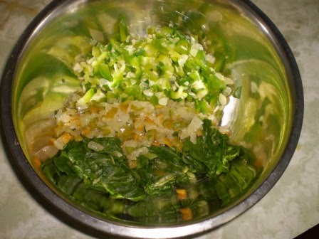 En un bol mezclamos: la acelga, los zapallitos, la cebolla.