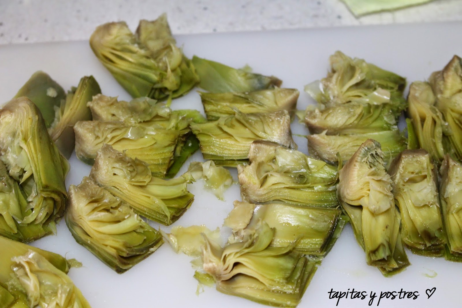 Mientras cortamos las alcachofas cocidas en cuartos. Descartamos las hojas que puedan estar duras.