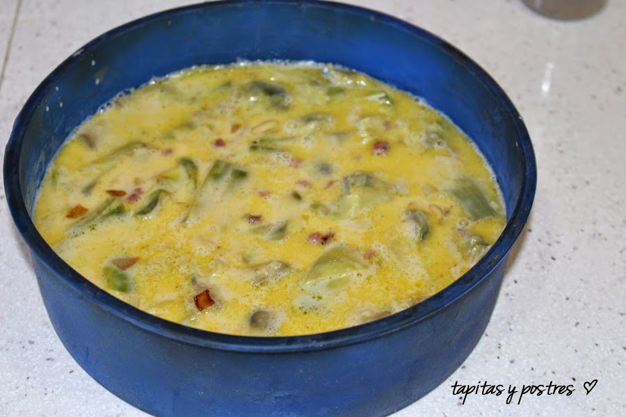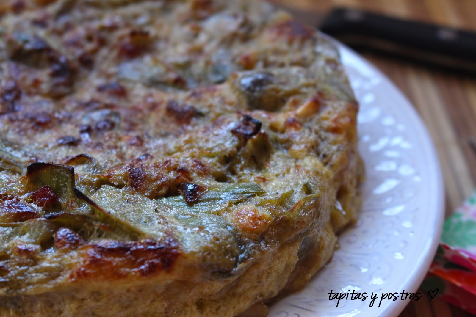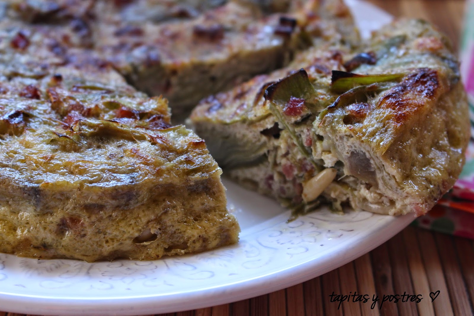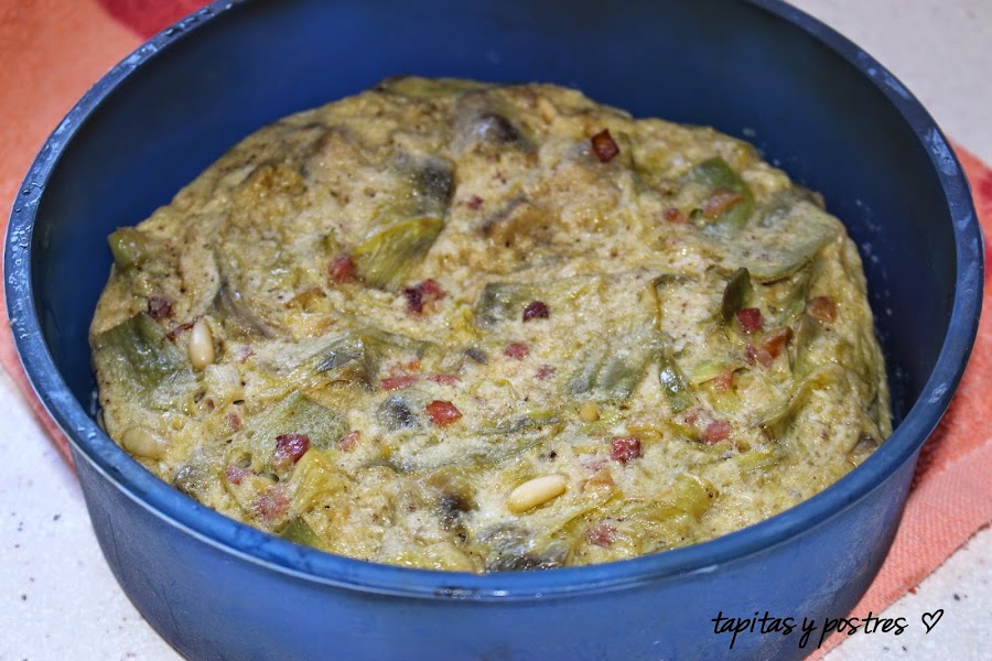 He querido variar un poco de las versiones tradicionales, ya sabeis guisadas, con jamón... y de casualidad me llega esta receta del blog Chup chup chup, con una tarta salada de alcachofas.