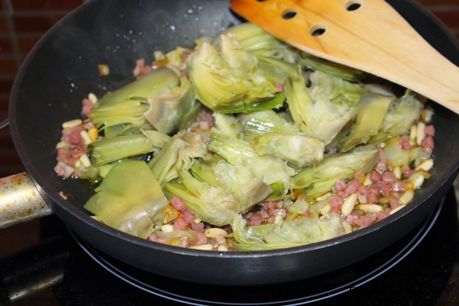 Mientras sofreímos en una sartén con un poco de aceite el ajo y la cebolla picaditos. Agregamos el jamón en taquitos y los piñones. Cortamos las alcachofas y las añadimos a la sartén. Le damos unas vueltas para que se impregnen del sabor de todos los ingredientes.