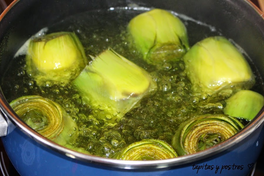 Pelamos las alcachofas y le quitamos todas las hojas duras. Las dejamos en un recipiente con medio limón mientras ponemos a hervir una cacerola con abundante agua. Cuando el agua hierva echamos las alcachofas y las cocemos hasta que estén tiernas, unos diez minitos. Las dejamos enfriar.