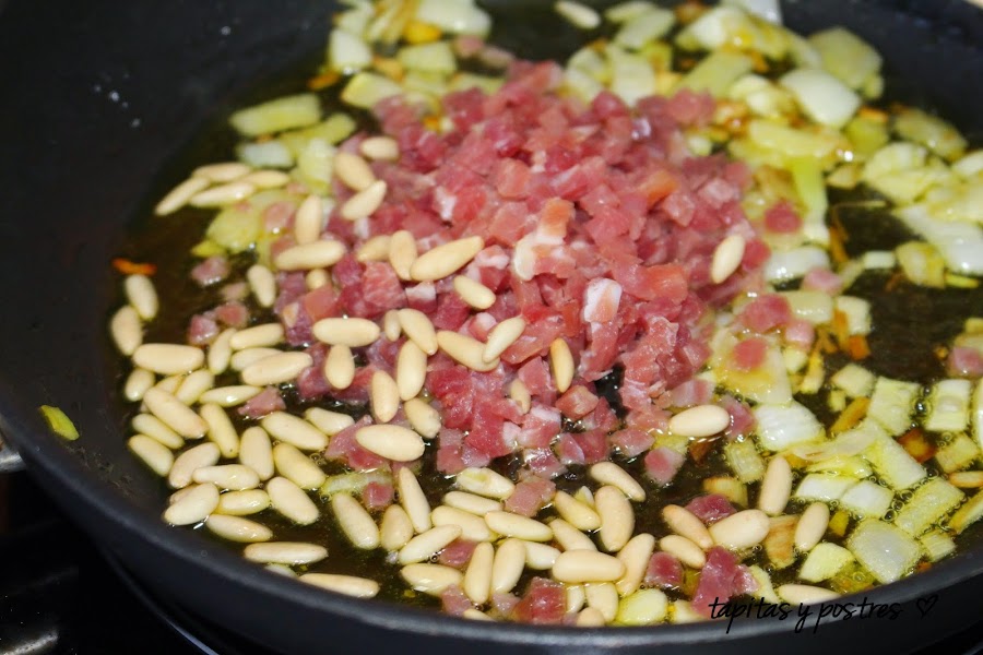 Cuando estén casi hechos, añadimos el jamón a taquitos y los piñones.Lo sofreímos un poco.