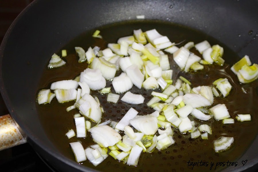 En una sartén grande sofreímos un diente de ajo y la cebolla picaditos.