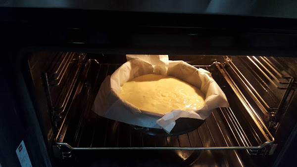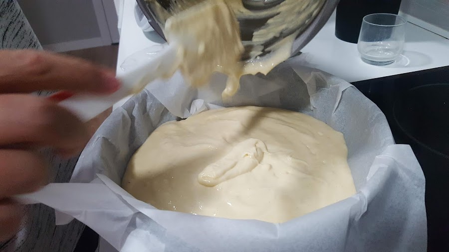 1.- Precalentamos el horno a 180º y forramos un molde redondo desmoldable, con papel de hornear.