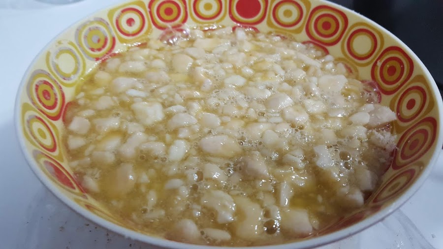 3.- Terminado este tiempo, vacíamos la mezcla en el de las almendras y lo reservamos, para ponerlo una vez que esté horneado el bizcocho.