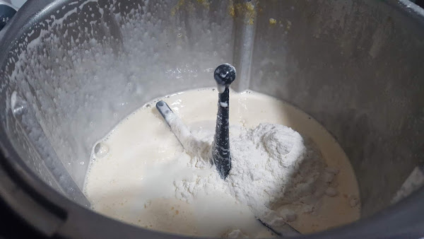 7.- Añadimos la nata (crema de leche), la harina, la levadura y un pellizco de sal y programamos 10 segundos, velocidad 2. Una vez terminado el tiempo lo terminamos de mezclar con la espátula.