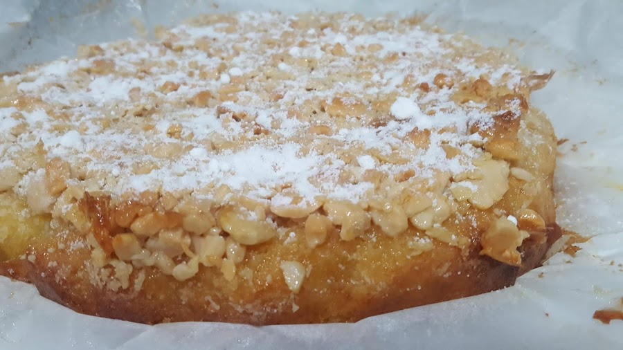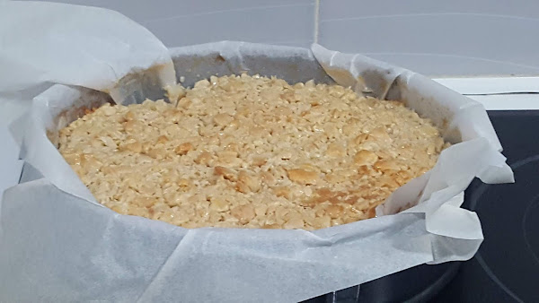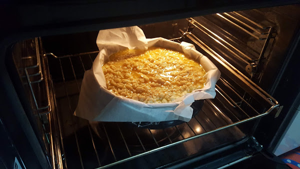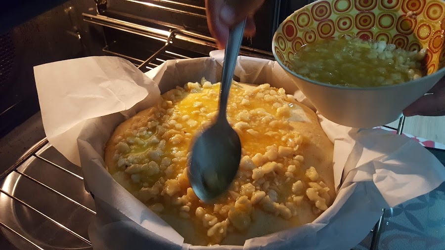 9.- Comprobamos que el bizcocho esté hecho, pinchando con una varilla y cuando salga limpia, lo sacamos del horno, para echarle por encima la mezcla de almendras que teníamos reservadas en el bol y volvemos a hornear unos 15 minutos, a la misma temperatura.