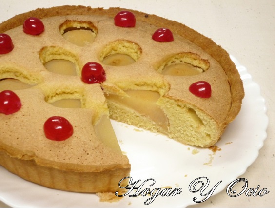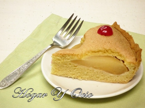 5. Colocamos las mitades de pera bien escurridas en la superficie del pastel. Horneamos durante 40 - 45 minutos. Vigilamos la tarta en el horno de vez en cuando, y si es necesario colocamos un poco de papel vegetal sobre ella para que no se dore demasiado.