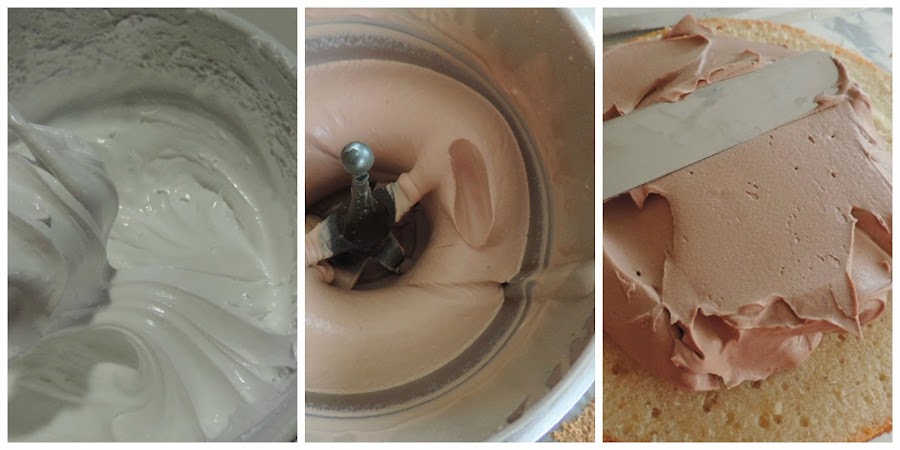 Hemos preparado un bizcocho de vainilla relleno de trufa cocida y cubierta de merengue.Cuando la tarta es para el cumple de un niño me gusta más cubrir con nata montada (crema de leche),pero como resulta que en esas fechas estábamos a casi 40º grados y la tarta la tenía que transportar,la nata (crema de leche) no era muy recomendable.También pensé en un buttercream,pero estaba en las mismas,así que como último recurso un merengue italiano que aguanta más las altas temperaturas.