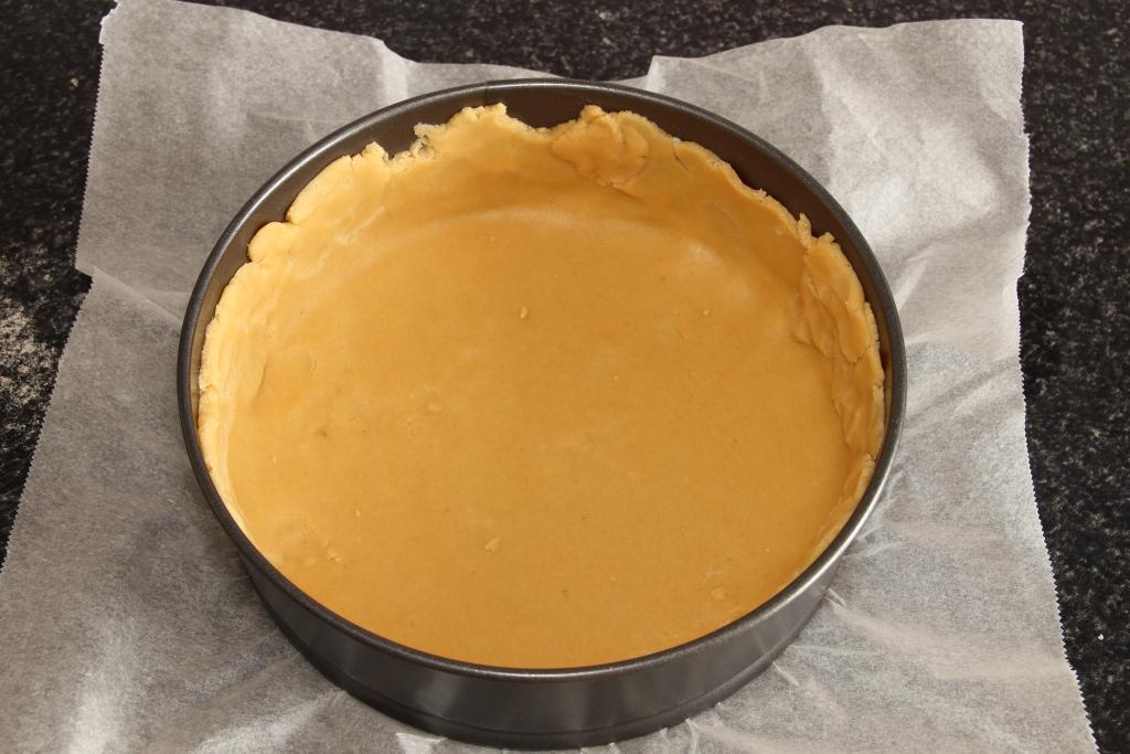 Cubrimos el molde (fondo y paredes), repartimos bien que quede del mismo grosor por todo y reservamos.