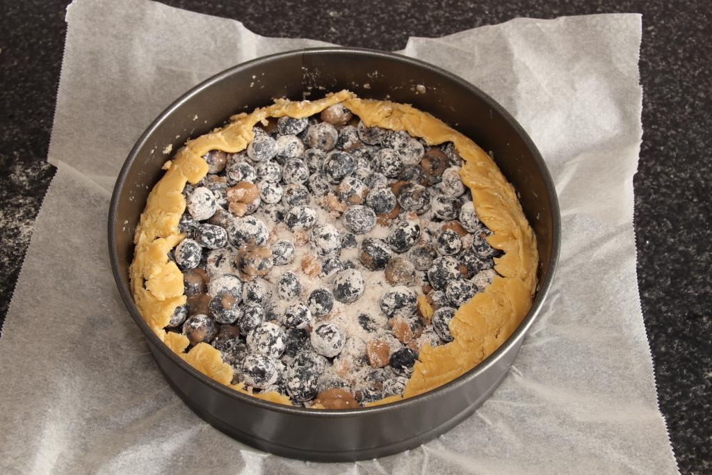 Consejo: La pasta quebrada se puede hacer de víspera y dejarla envuelta en film en la nevera. Si vemos que al hornear se nos dora la superficie demasiado rápido, cubrimos con papel de aluminio y seguimos con el horneado. Nos sobrará pasta quebrada, la envolvemos en film transparente y la congelamos para una próxima utilización. Se pueden utilizar arándanos congelados, dejamos descongelar, mezclamos el jugo que sueltan con la harina de maíz y le damos un hervor al fuego, dejamos enfriar y mezclamos con el resto de ingredientes del relleno. Ponemos el molde sobre una bandeja de horno en vez de en la rejilla porque seguramente suelte líquido, y así no mancharemos el horno. La decoración es opcional, cada cual tiene su gusto.